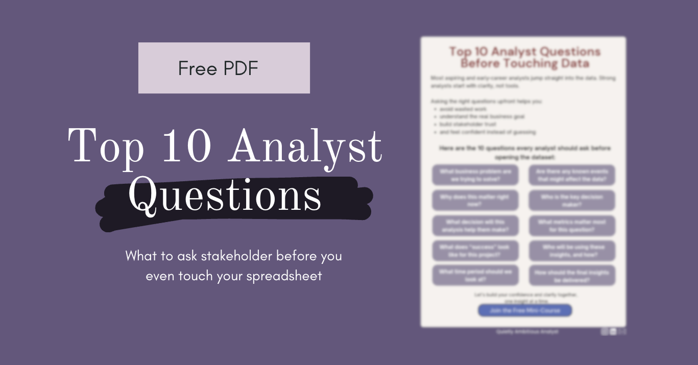 A simple guide to help you start every project the right way. Learn the key questions strong analysts use to understand the problem, clarify goals, and avoid wasting hours on the wrong work.